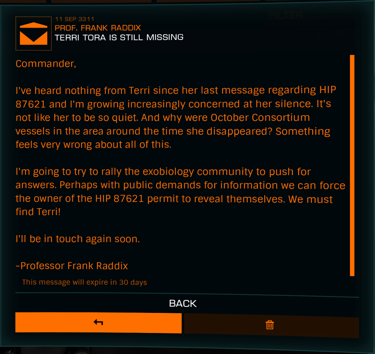 I’ve traced her last position to somewhere in the vicinity of COL 285 SECTOR TQ-A B 15-4. Has to have been within a 10 light year radius. Head out there and see if you can find anything. Look for comms beacons, relays, anything that could store information. I’ve added her transponder ID to this message, so your ship computer will filter out and automatically decode any secure comms sent from Terri.